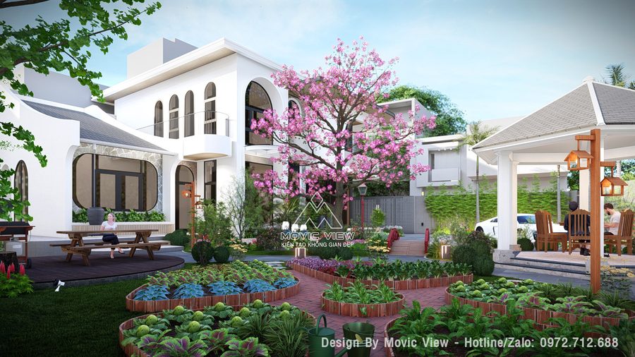 Mảng xanh thông thoáng: Sân vườn hiện đại thường có nhiều không gian trống và cây xanh phân bổ đều để không tạo cảm giác quá tải. Những mảng cỏ xanh mướt hoặc các loại cây bụi nhỏ gọn thường được lựa chọn thay vì cây cối quá lớn hoặc rậm rạp.