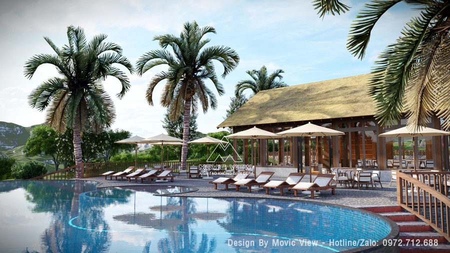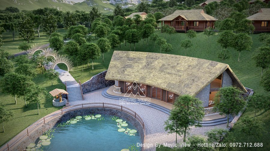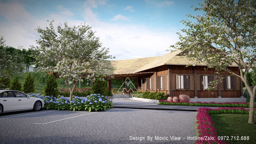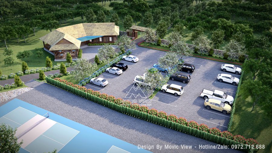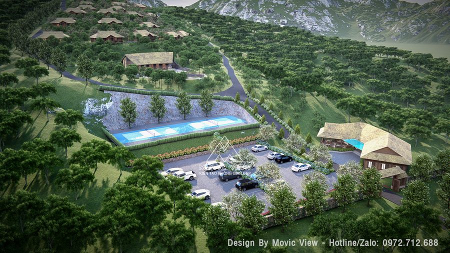 Ngay từ cổng vào, du khách sẽ được chào đón bởi không gian xanh mát của cây cối và bãi đỗ xe rộng rãi, dễ dàng tiếp cận các khu vực chính của khu nghỉ dưỡng. Các biệt thự được xây dựng theo mô hình tựa như những ngôi nhà tranh, mang đến một cảm giác gần gũi và ấm cúng. Khu vực chung bao gồm hồ bơi lớn, không gian xanh rộng lớn với nhiều cây cối tạo nên bầu không khí trong lành và dễ chịu.