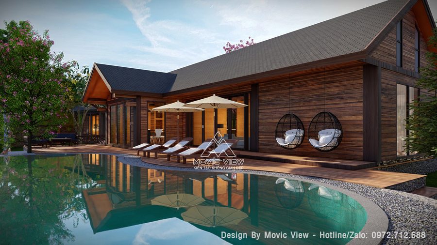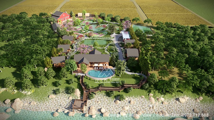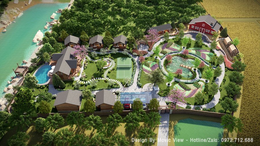 Tận dụng view sống phía sau khu đất, tạo bể bơi vô cực vô cùng thiên nhiên, kế hợp một số sàn checkin ra sông. Tổng thể công trình với nhiều cây xanh, hoa, cây ăn quả tạo không gian thư thái khi bước vào.
