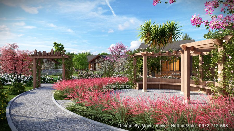 Cảnh quan đường dạo thiết kế uốn lượn mềm mại, đường bước dạo đan xen thảm cỏ xanh mướt, ít bị bê tông hóa.