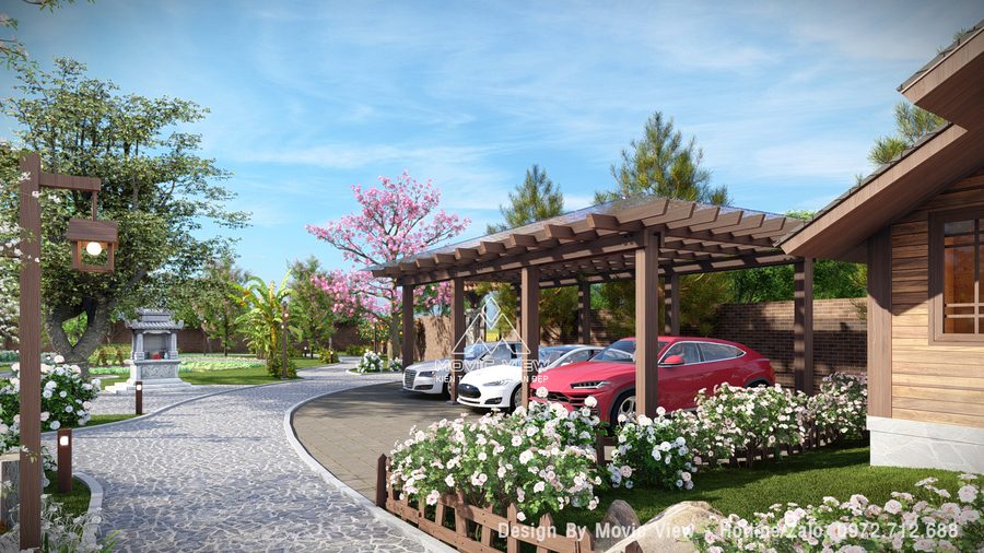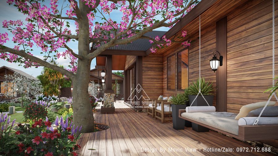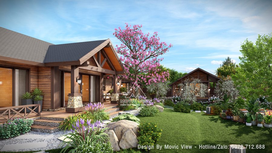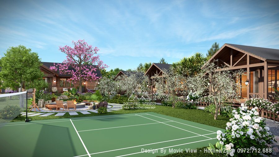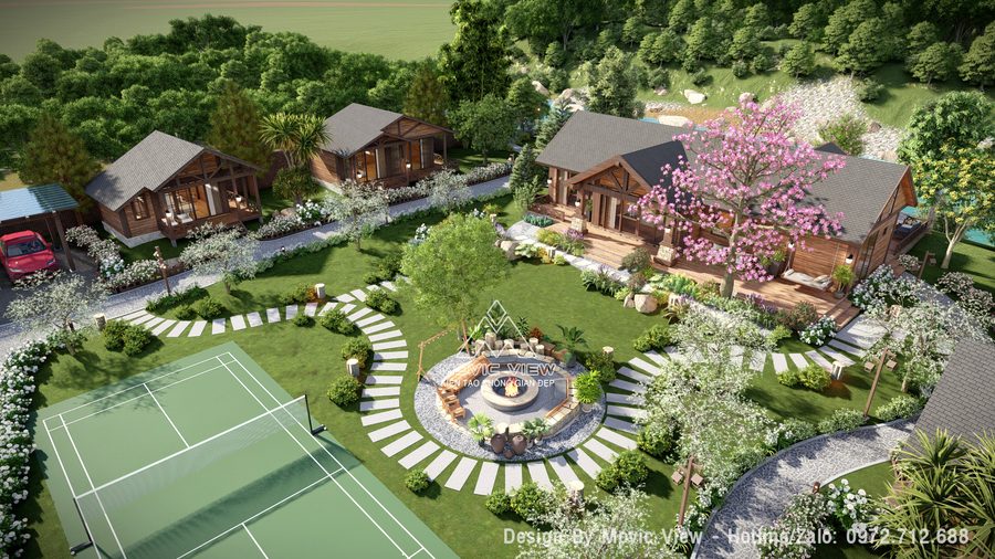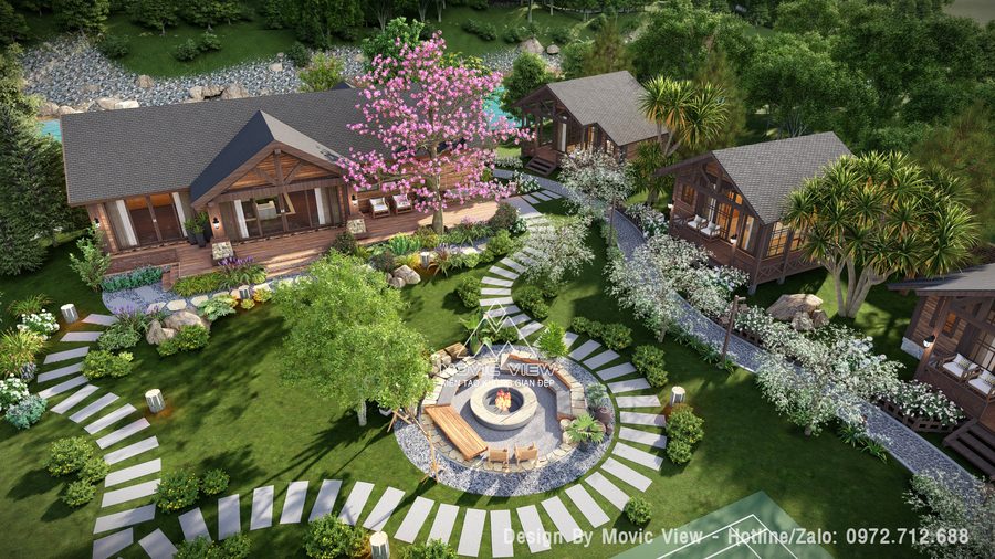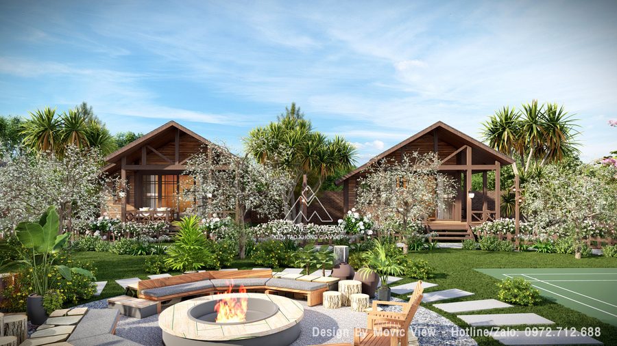Sân ở giữa làm lõi cảnh quan, tạo sân BBQ, lửa trại, vị trí gần nhà chính và bungalow, thuận tiện cho các thành viên ngồi quây quần bên nhau.