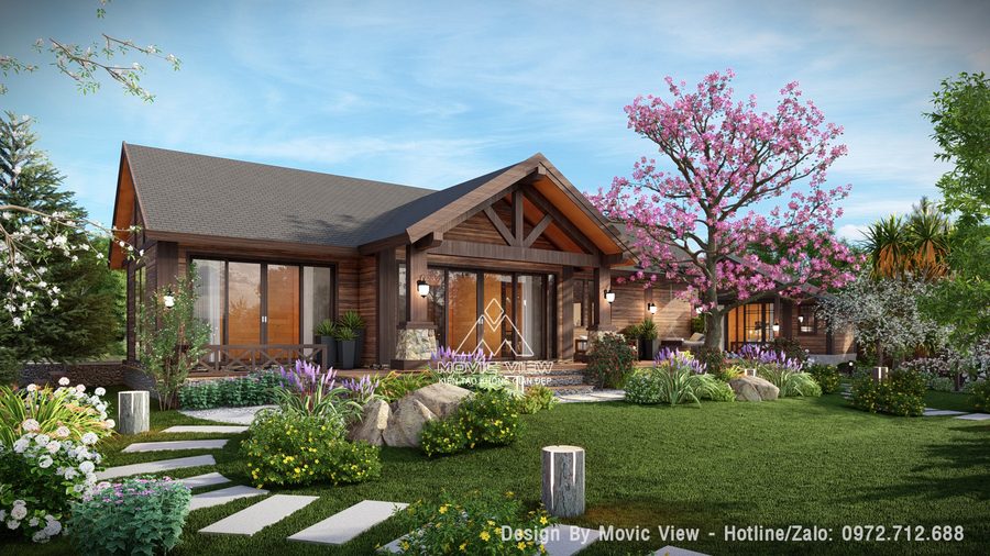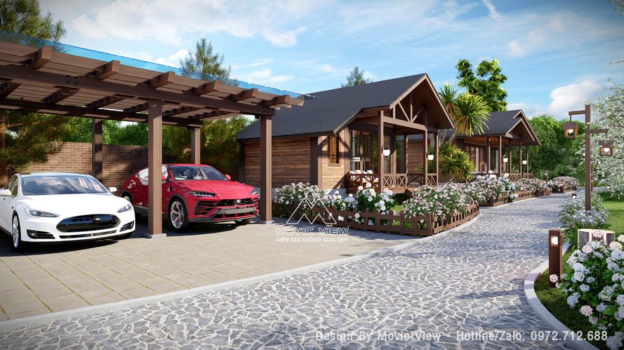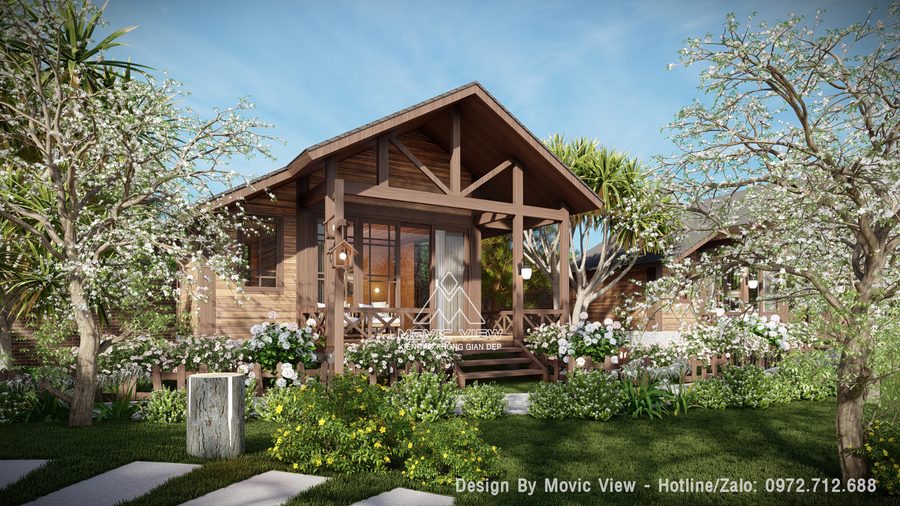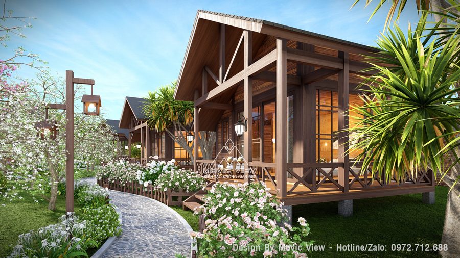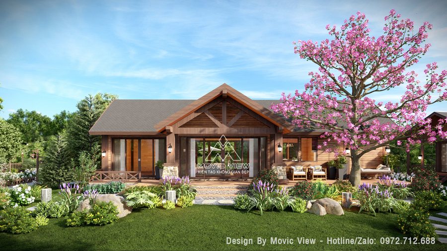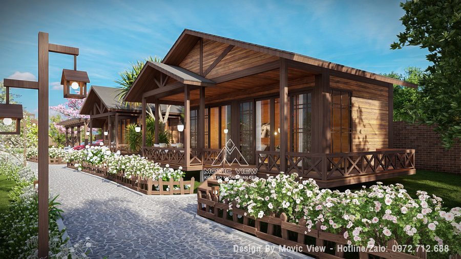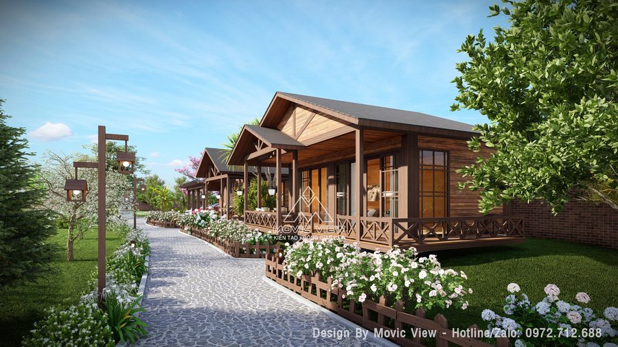 Các công trình nhà 1 tầng, chất liệu gỗ gần gũi, thân thiện.