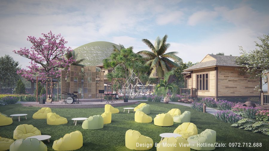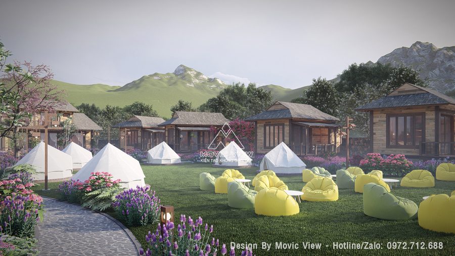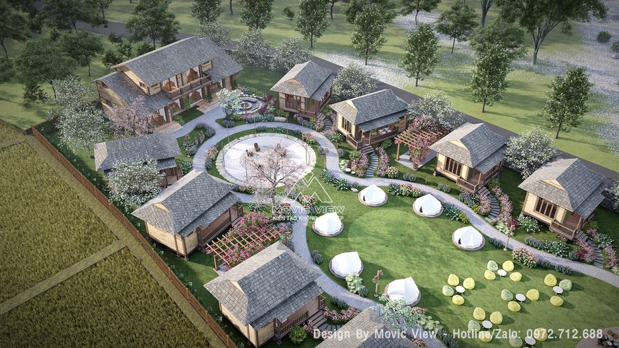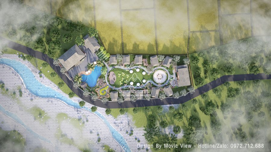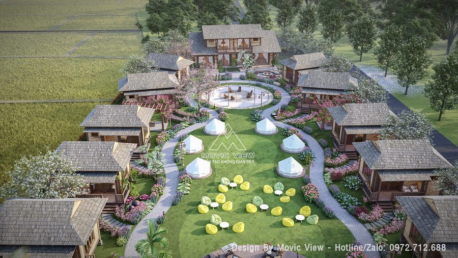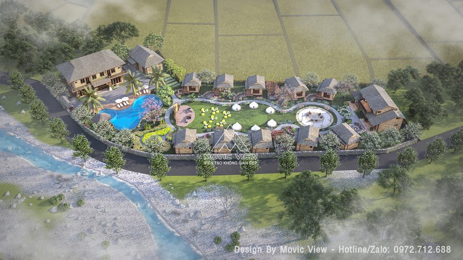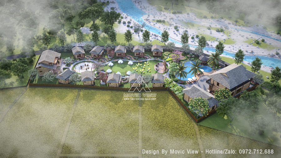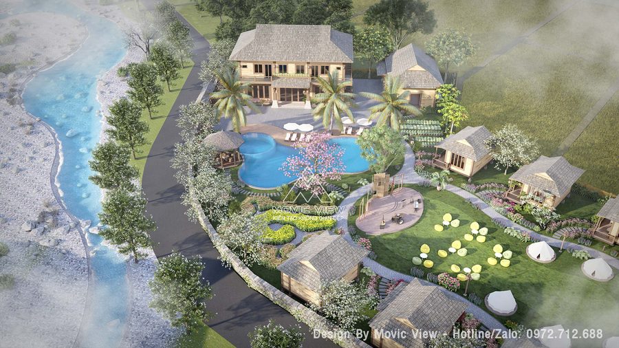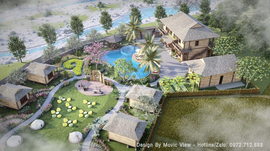 Công trình được thiết kế trên nền đất bằng phẳng, có hình dáng trải dài. Thiết kế với các hạng mục nhà chính trung tâm, bể bơi, các căn bungalow, khu vực BBQ, lửa trại ngoài trời.
