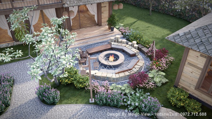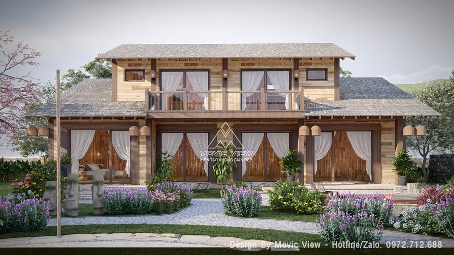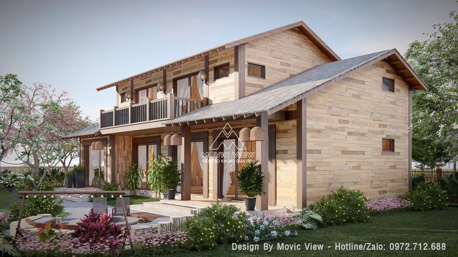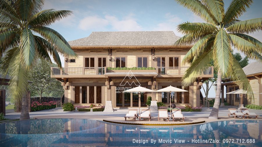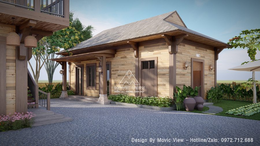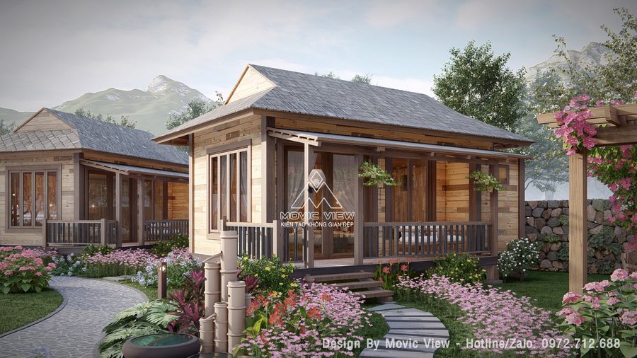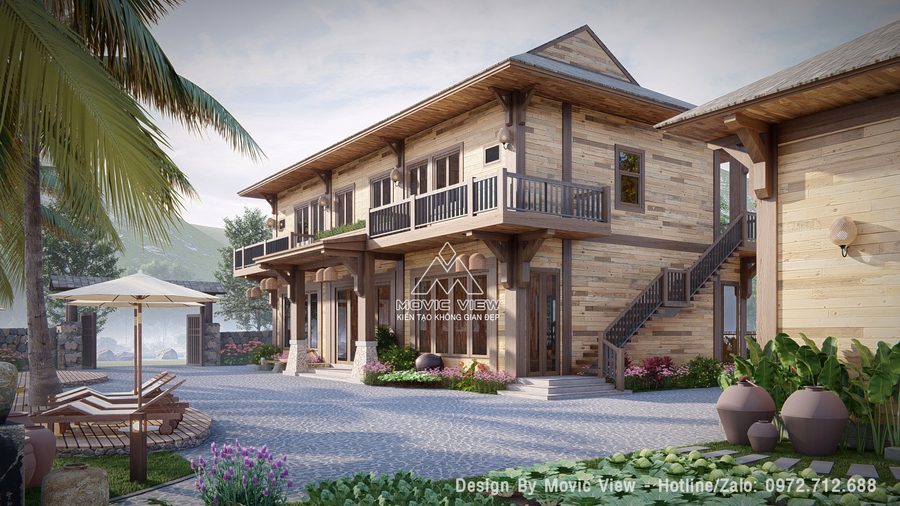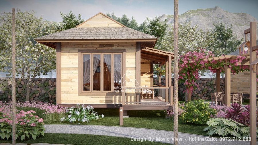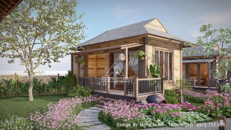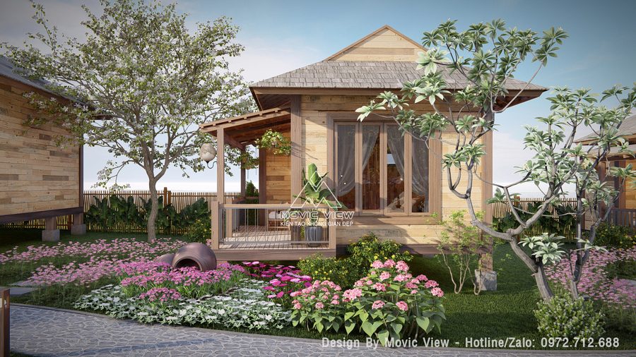 Công trình được thiết kế trên nền đất bằng phẳng, có hình dáng trải dài. Thiết kế với các hạng mục nhà chính trung tâm, bể bơi, các căn bungalow, khu vực BBQ, lửa trại ngoài trời.