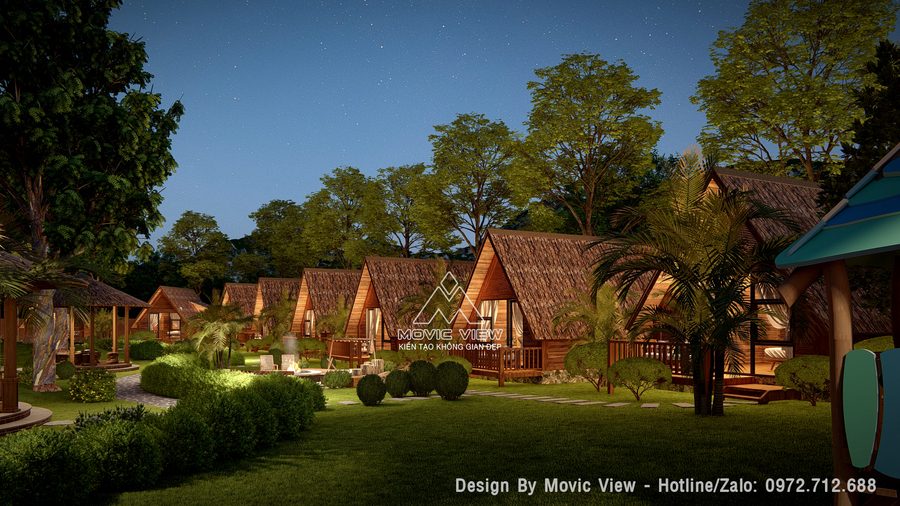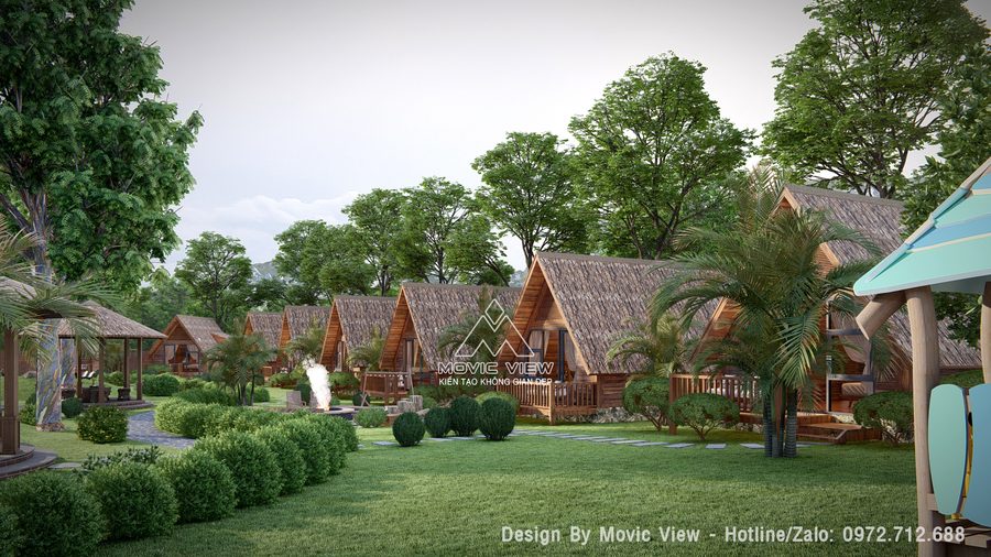 Khu vực thiên nhiên: Các căn bungalow hoặc nhà gỗ với thiết kế gần gũi với thiên nhiên, giúp khách hàng thư giãn và tận hưởng không gian xanh.