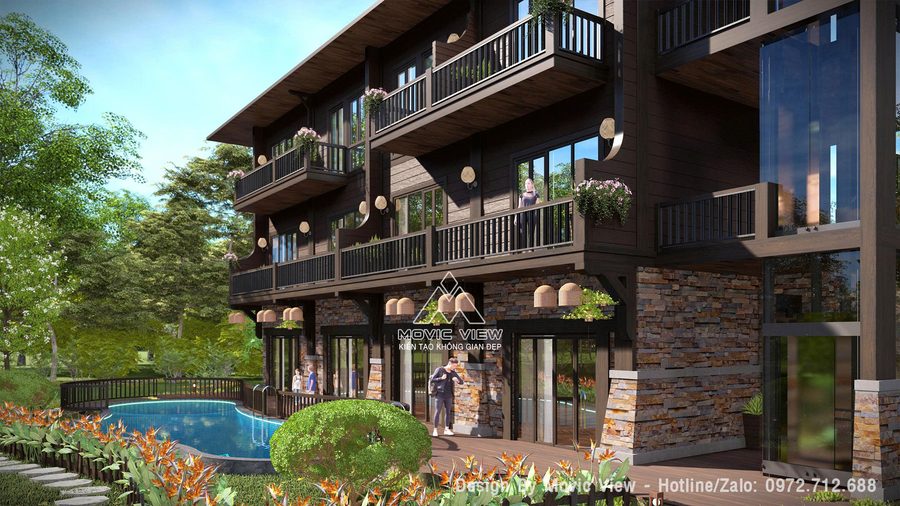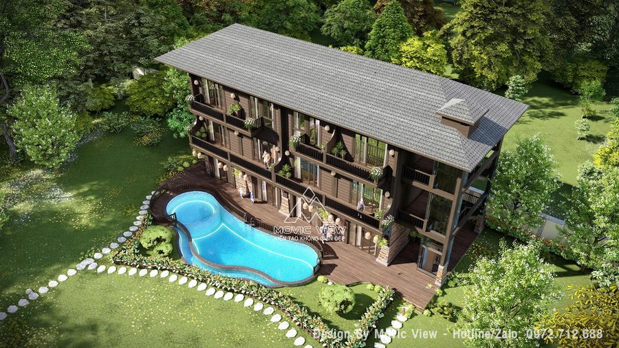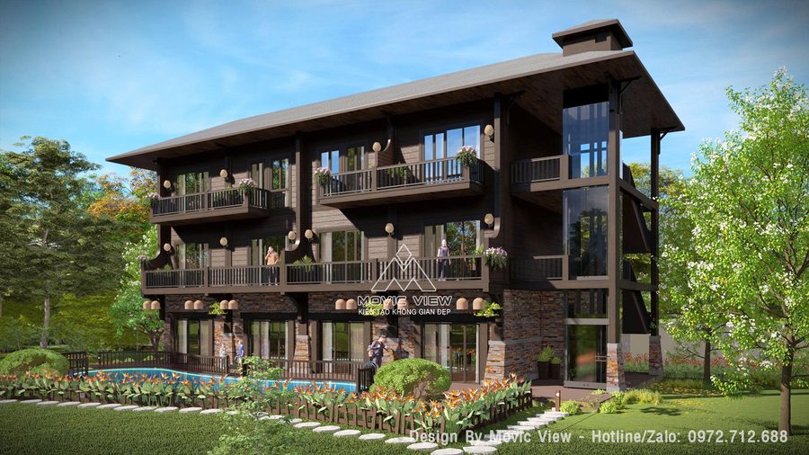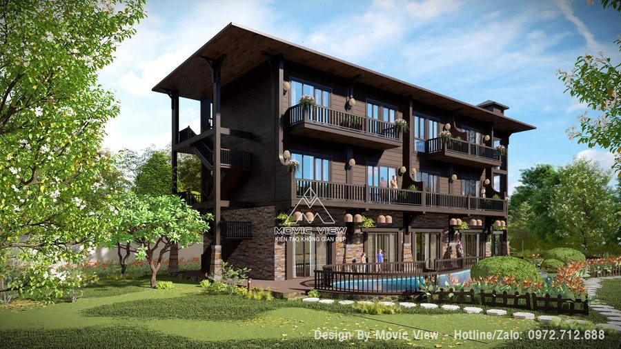 Thiết kế nhà hàng nghỉ dưỡng phong cách Tây Bắc sẽ mang đến một không gian ấm cúng, gần gũi với thiên nhiên và đậm đà bản sắc văn hóa dân tộc. Thiết kế kết hợp giữa nhà hàng và phòng lưu trú cho khách, công trình được thiết kế bổ sung bể bơi tăng dịch vụ tiện ích cho toàn khu.